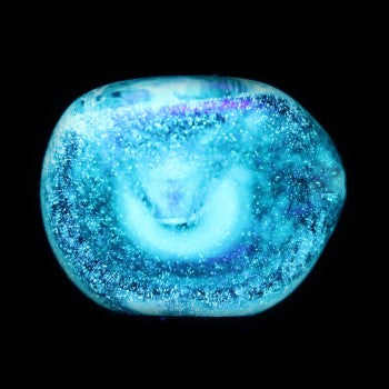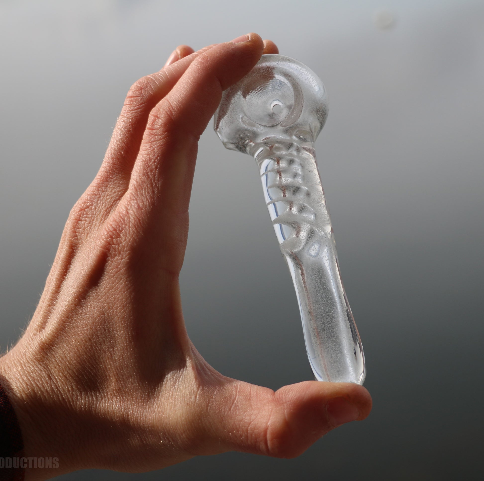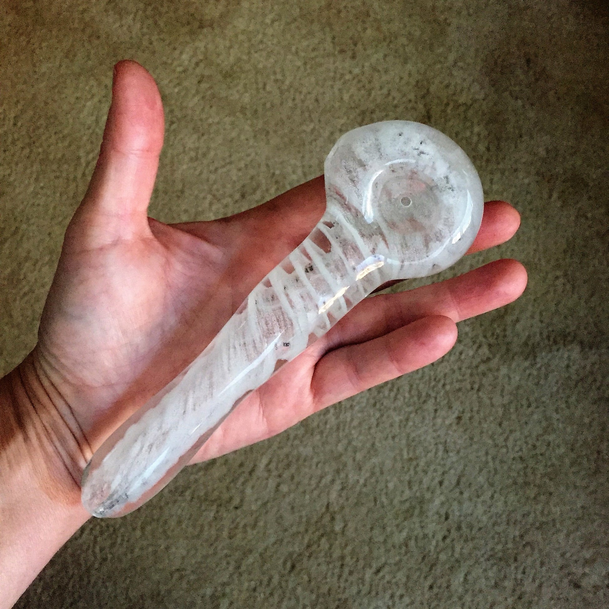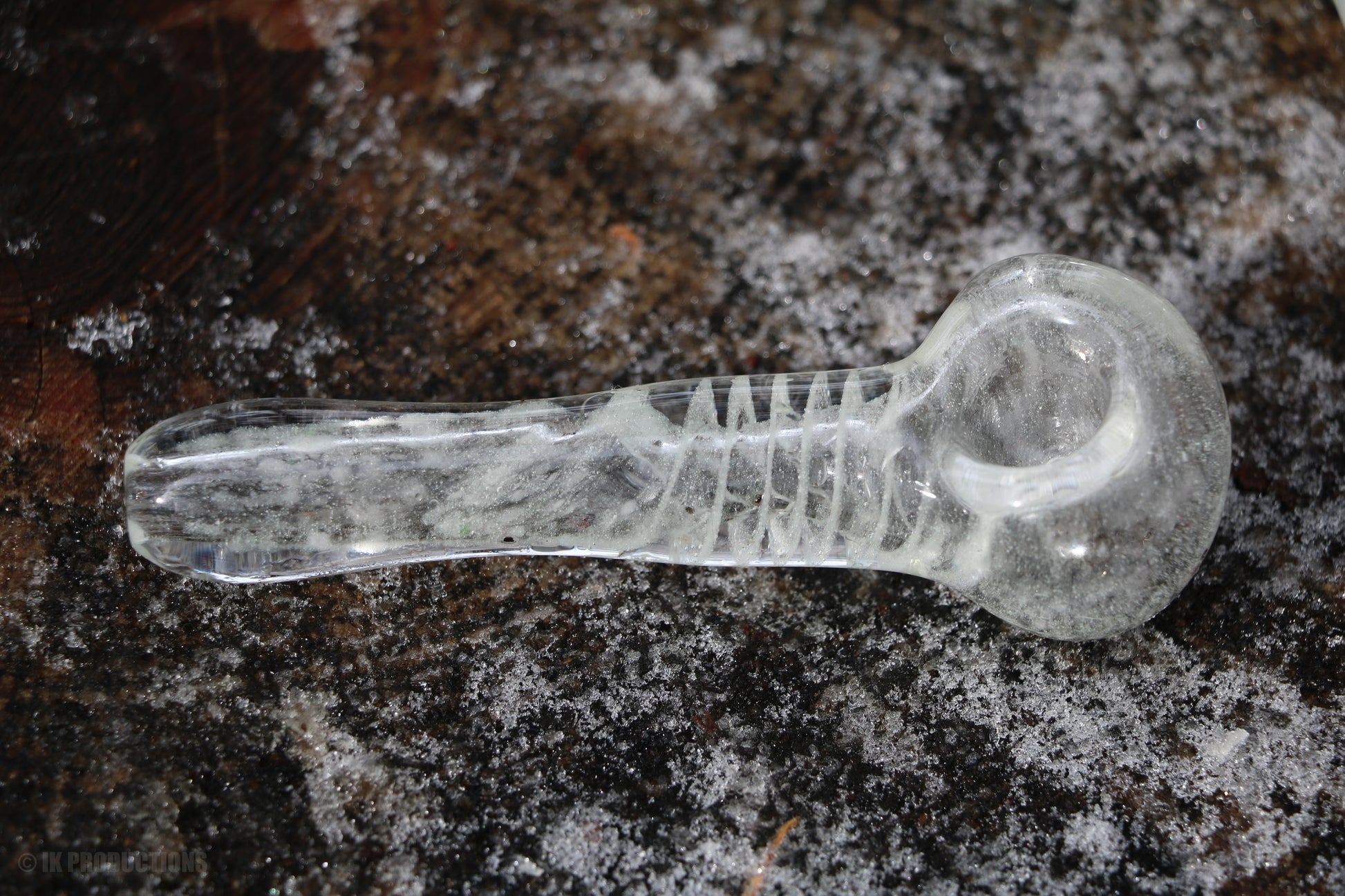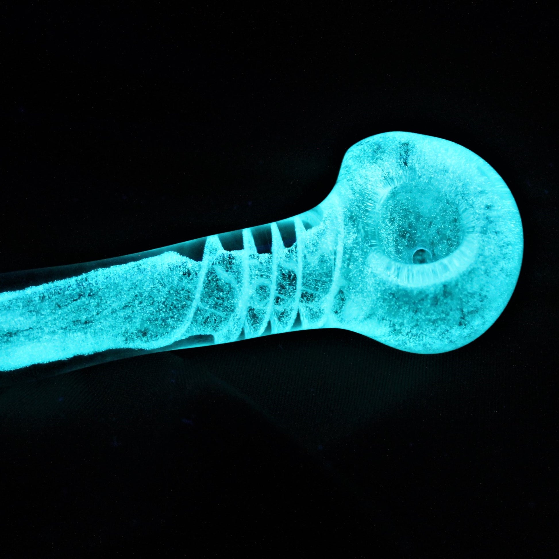 Our #1 seller: thick inside‑out glow‑in‑the‑dark frost pipe with a twist inside the stem. Made with BoroGlow™ glass (glows without any light source). Varies 4–5 inches.