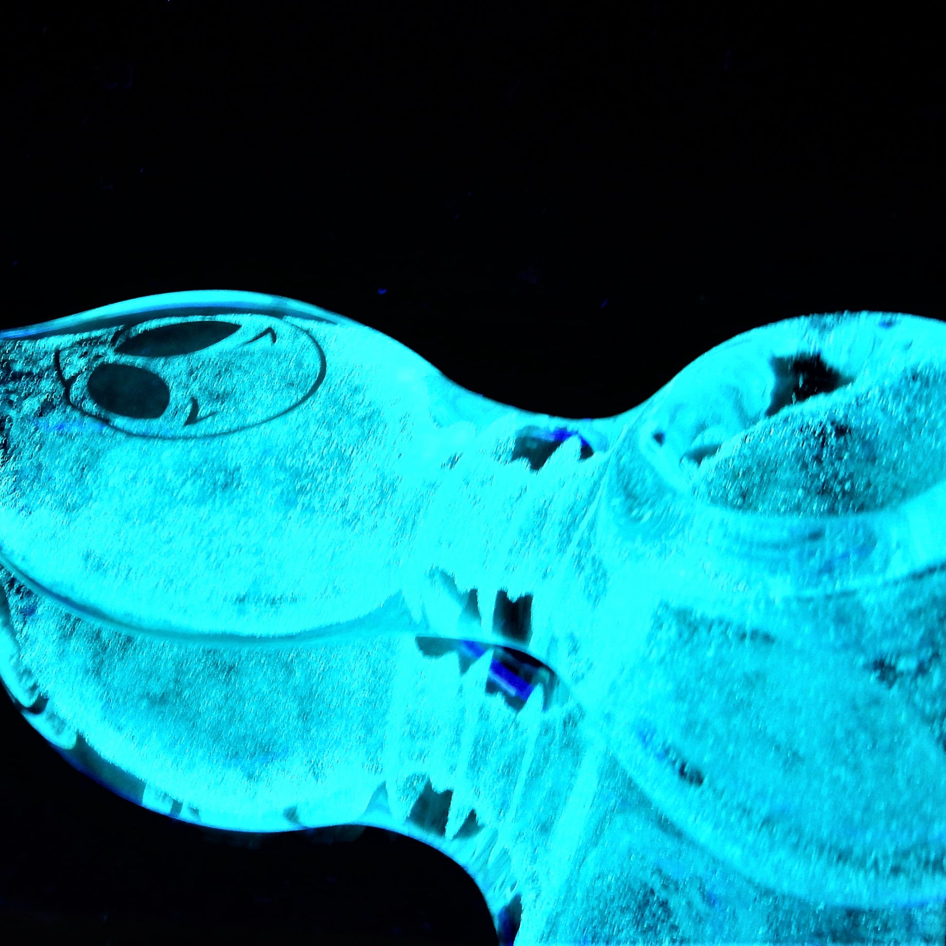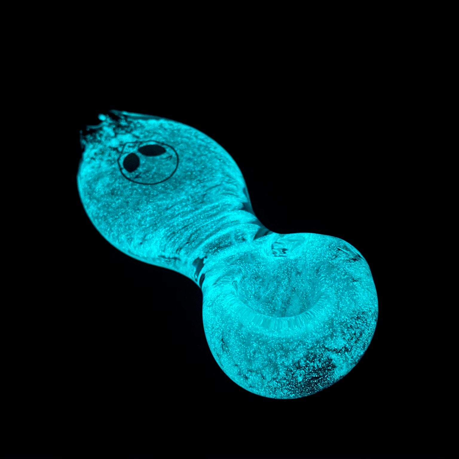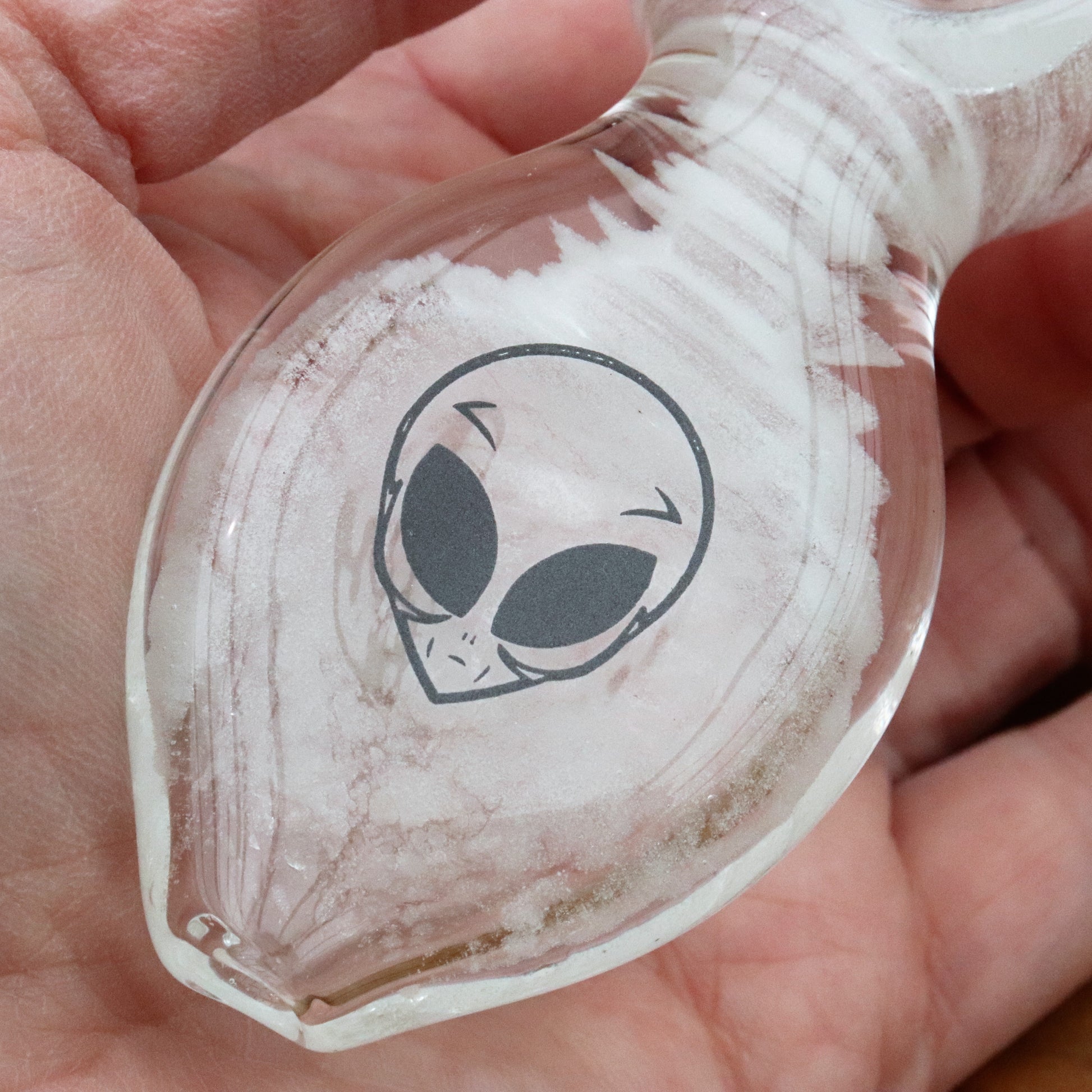 3.5"–4" thick glow frost chubby flat stem pipe with an alien head Glowprint and a twist in the stem. BoroGlow™ glass; Glowprint is fused ceramic (not a sticker).