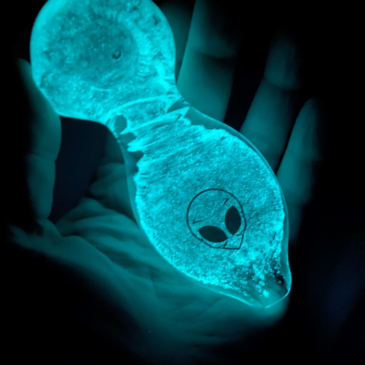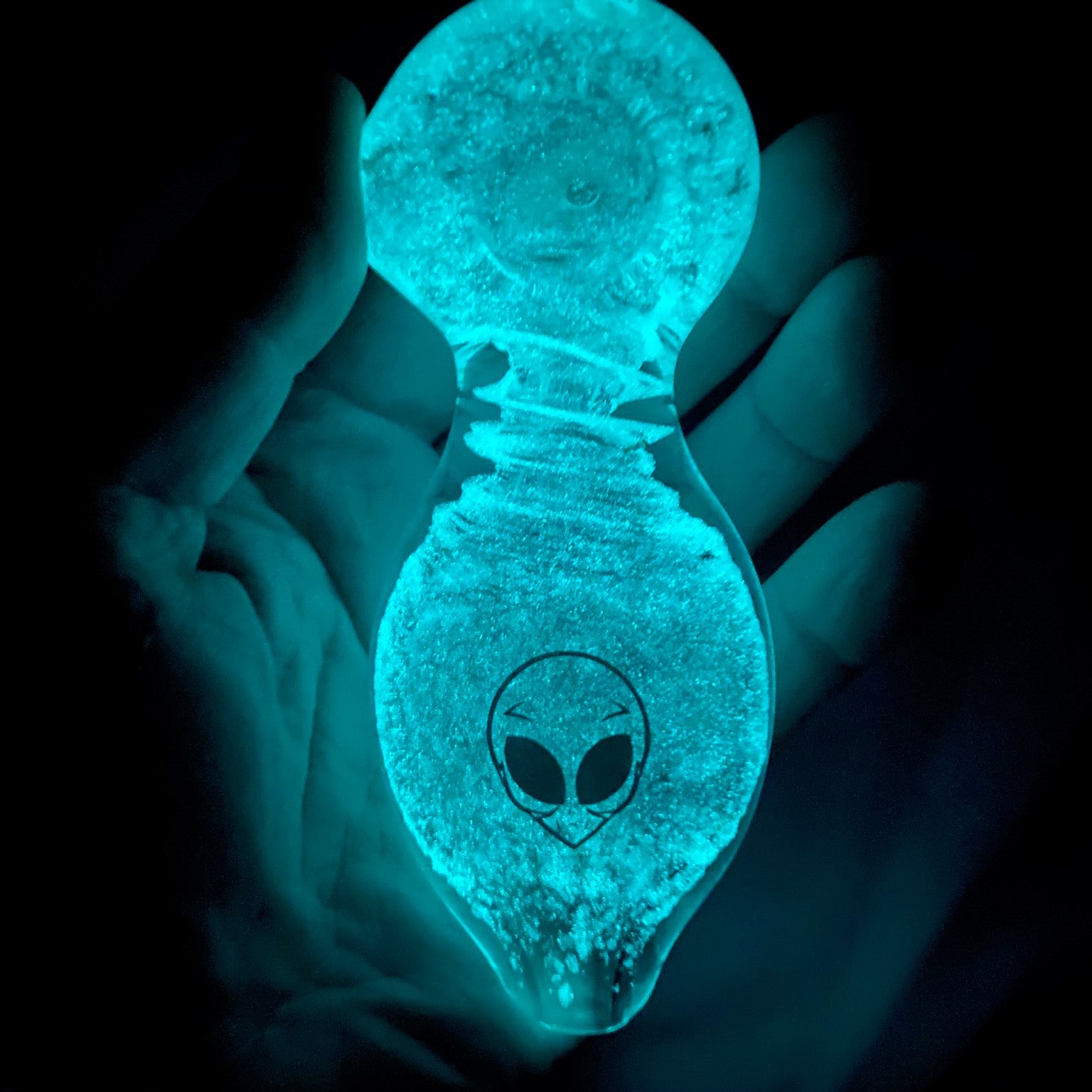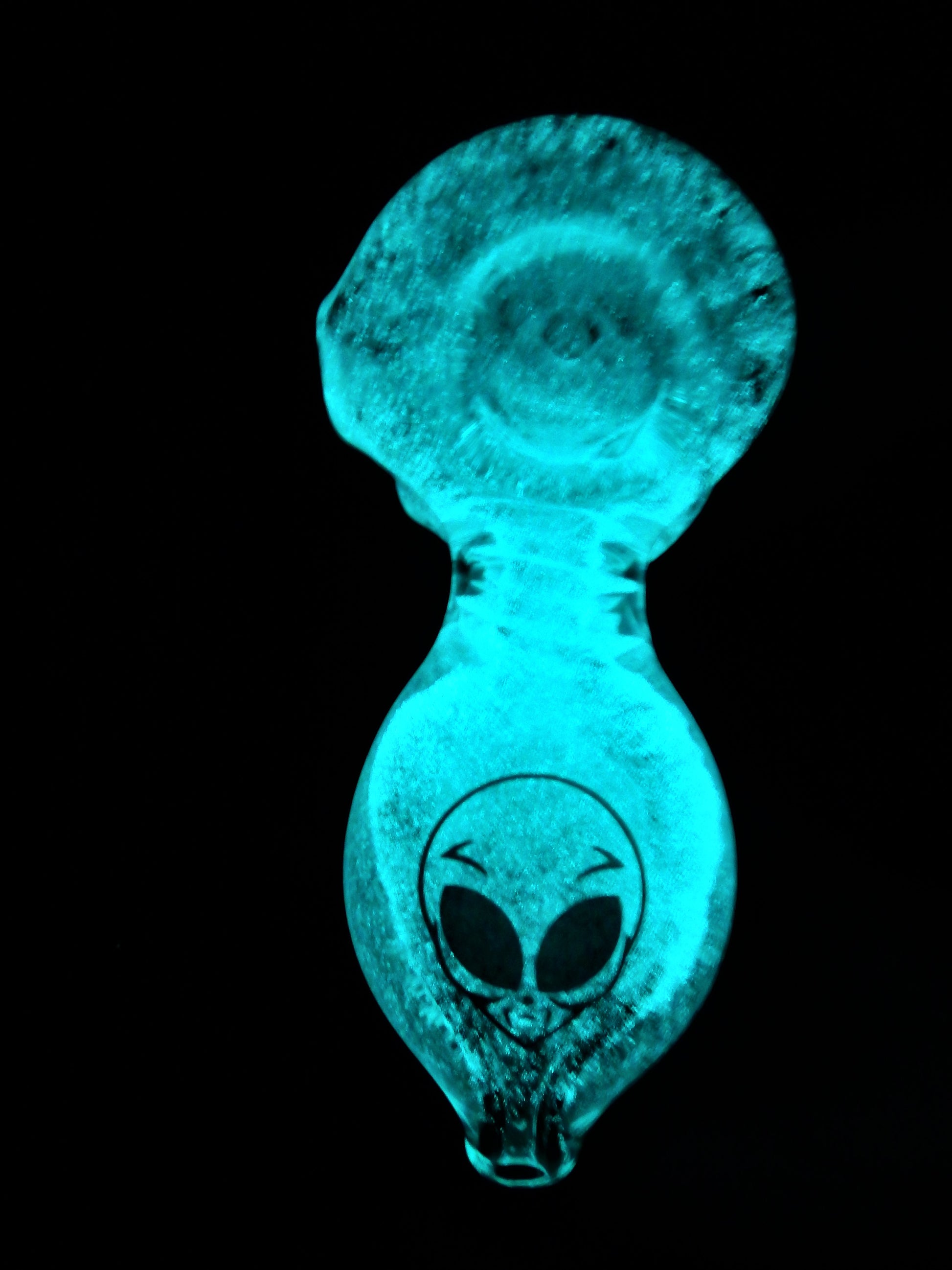 3.5"–4" thick glow frost chubby flat stem pipe with an alien head Glowprint and a twist in the stem. BoroGlow™ glass; Glowprint is fused ceramic (not a sticker).